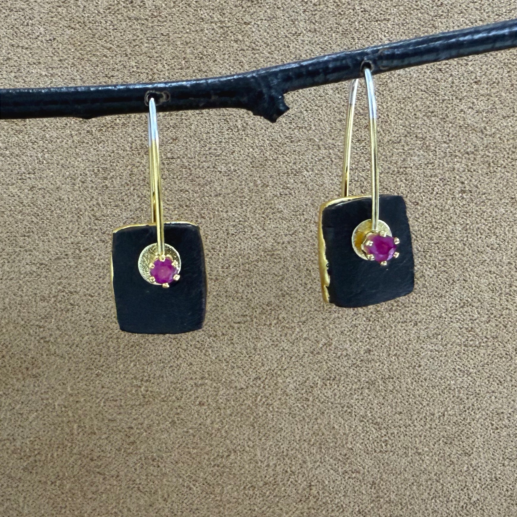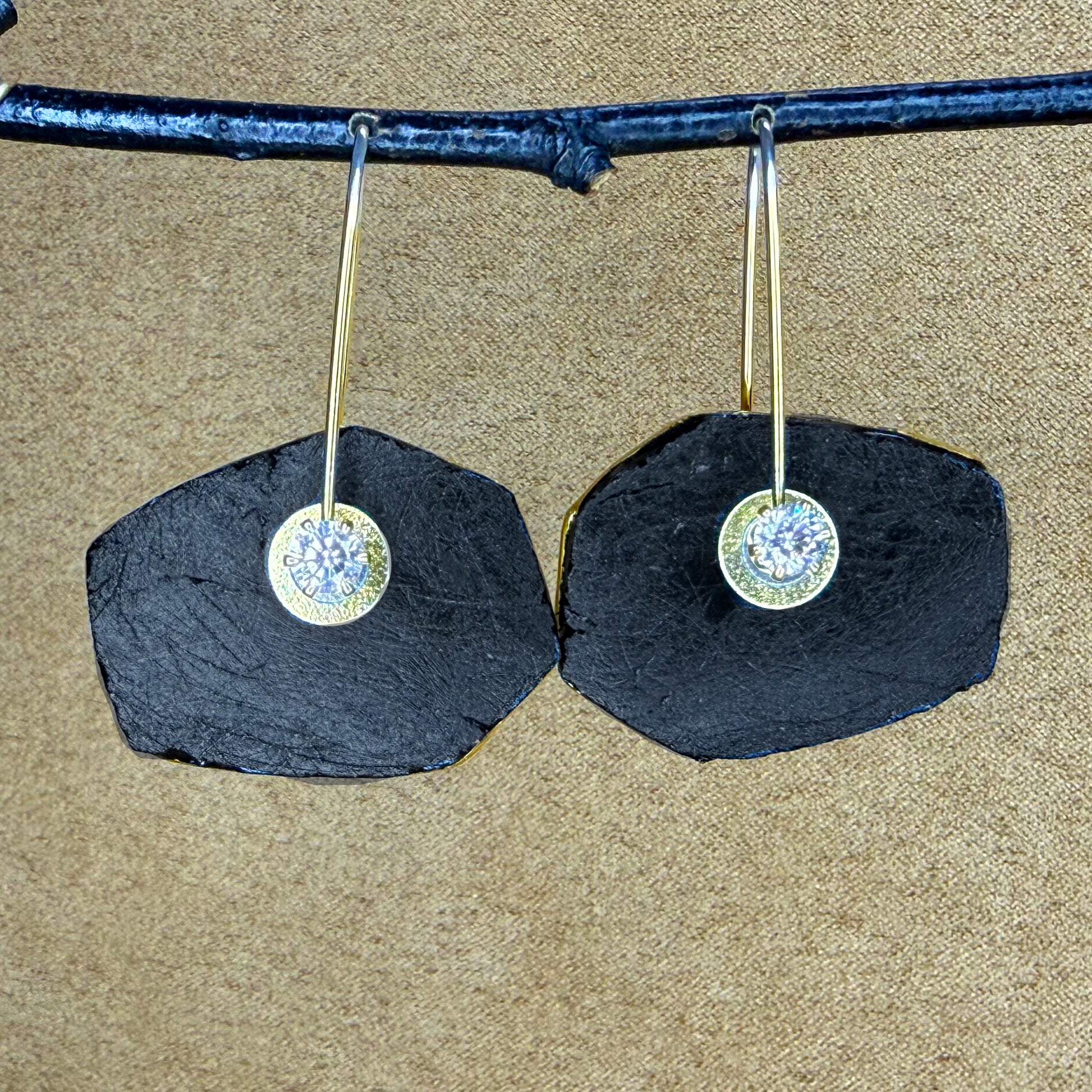 Anthracite is a very hard metamorphic version of coal which I cut and shape with lapidary tools. No two pairs are alike. I've contrasted the Anthracite with iridescent freshwater pearls or sparkling facetted stones. The backs are reinforced with mica and finished with 23k gold leaf. The ear wires are sterling silver plated with 18k gold (vermeil), left sterling where they rest in the ear, and they clip closed in the back. Posts are sterling silver with sterling silver backs.