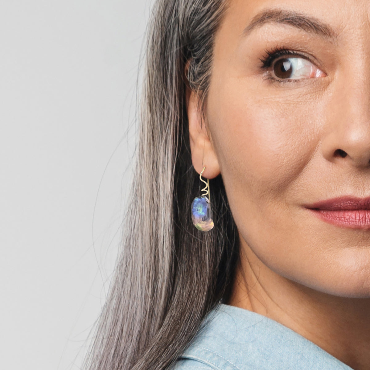 Made from luminous Baroque pearls I sourced from the American Gem Trade Association GemFair in Tucson earlier this year. They have tendril-like ear wires which clip closed in the back. I drill through the pearls with an ultrasonic drill using a slurry of water and fine grit. I spiral the ear wire and feed it directly through the pearl, which makes them very secure.