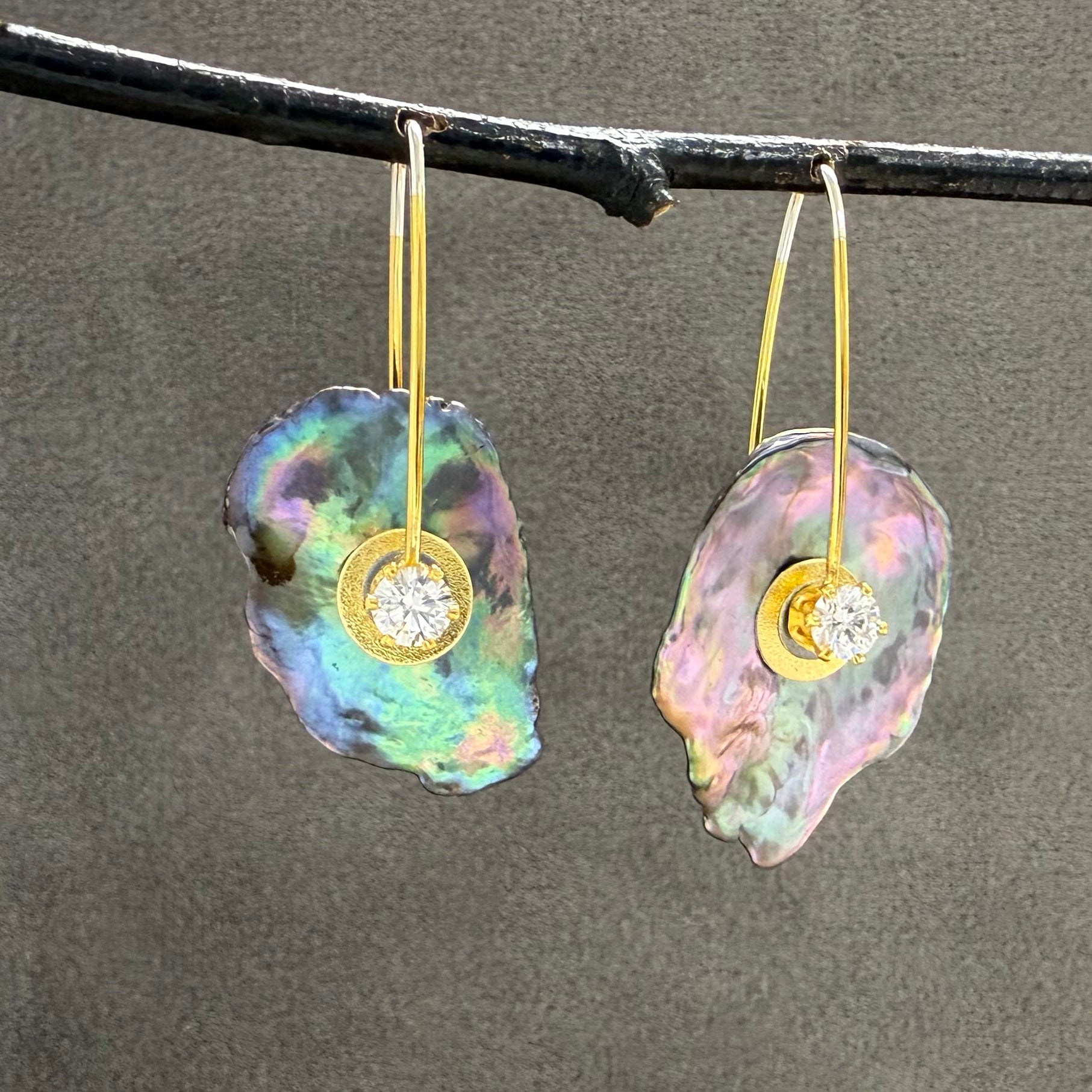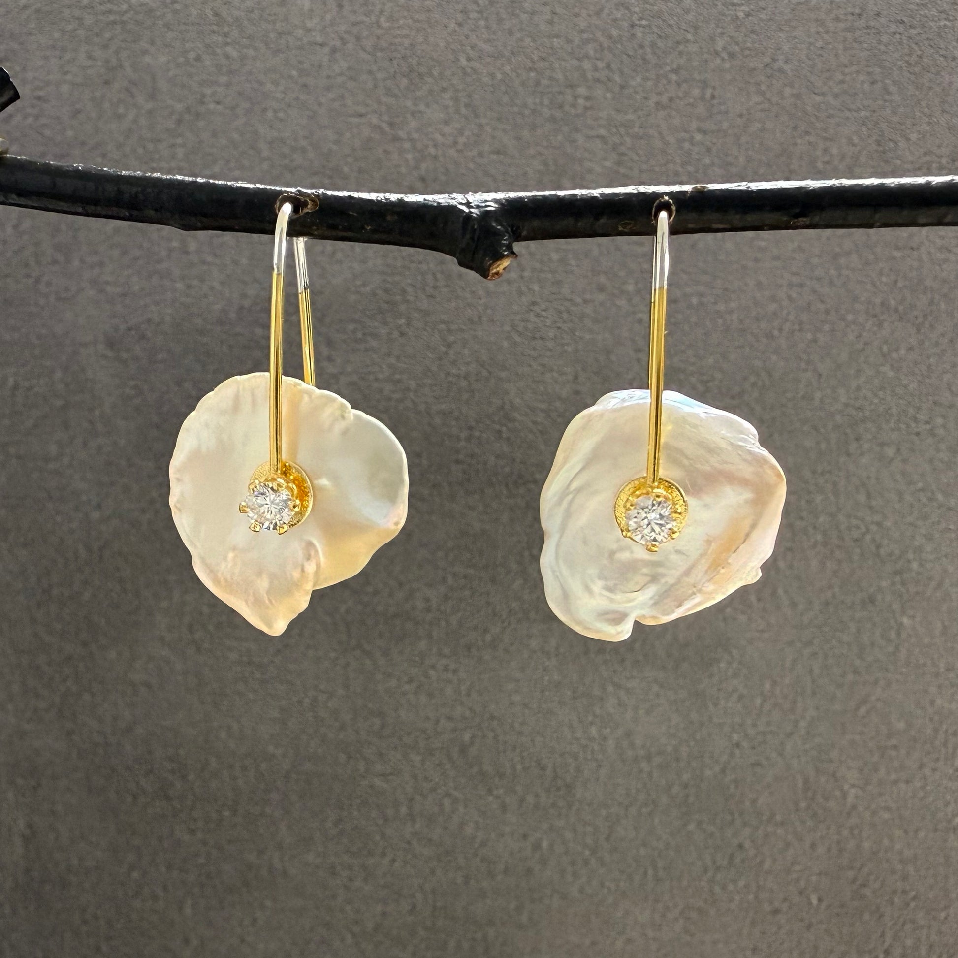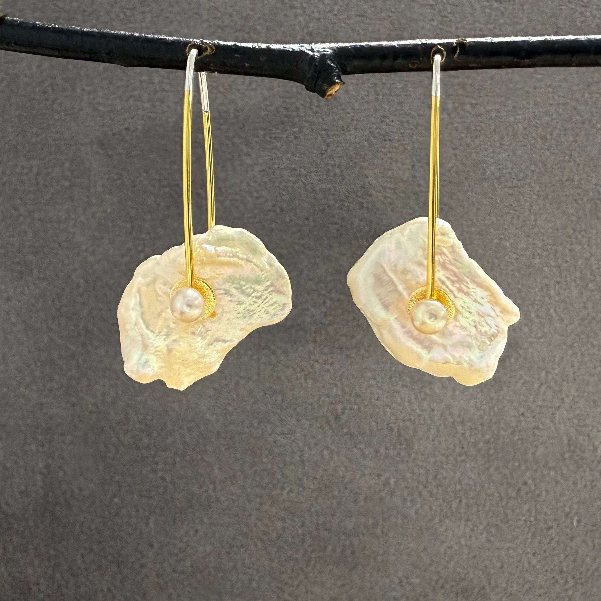 Keshi* Pearls are a kind of flatpearl that forms without a nucleus, so instead of creating a spherical shape, the nacre forms a disc. No two pairs are the same. I contrast these unique shapes with the preciseness of round freshwater pearls or cubic zirconia in the center. The earwires are sterling silver plated with 18k gold (vermeil), left sterling where they rest in the ear, unless otherwise noted (a few are all sterling). The earwires all clip closed in the back.