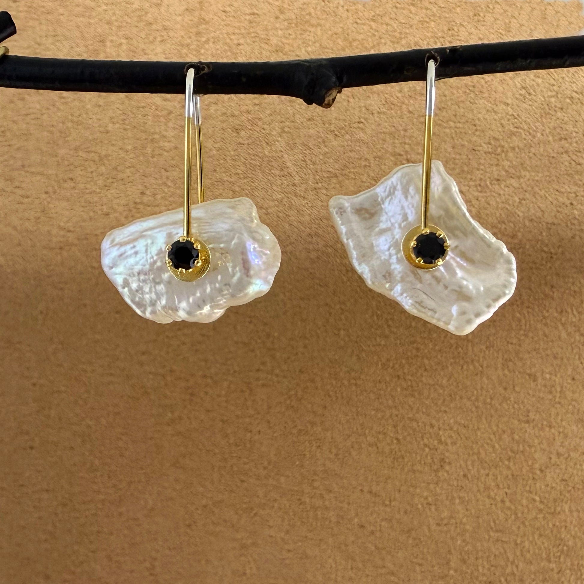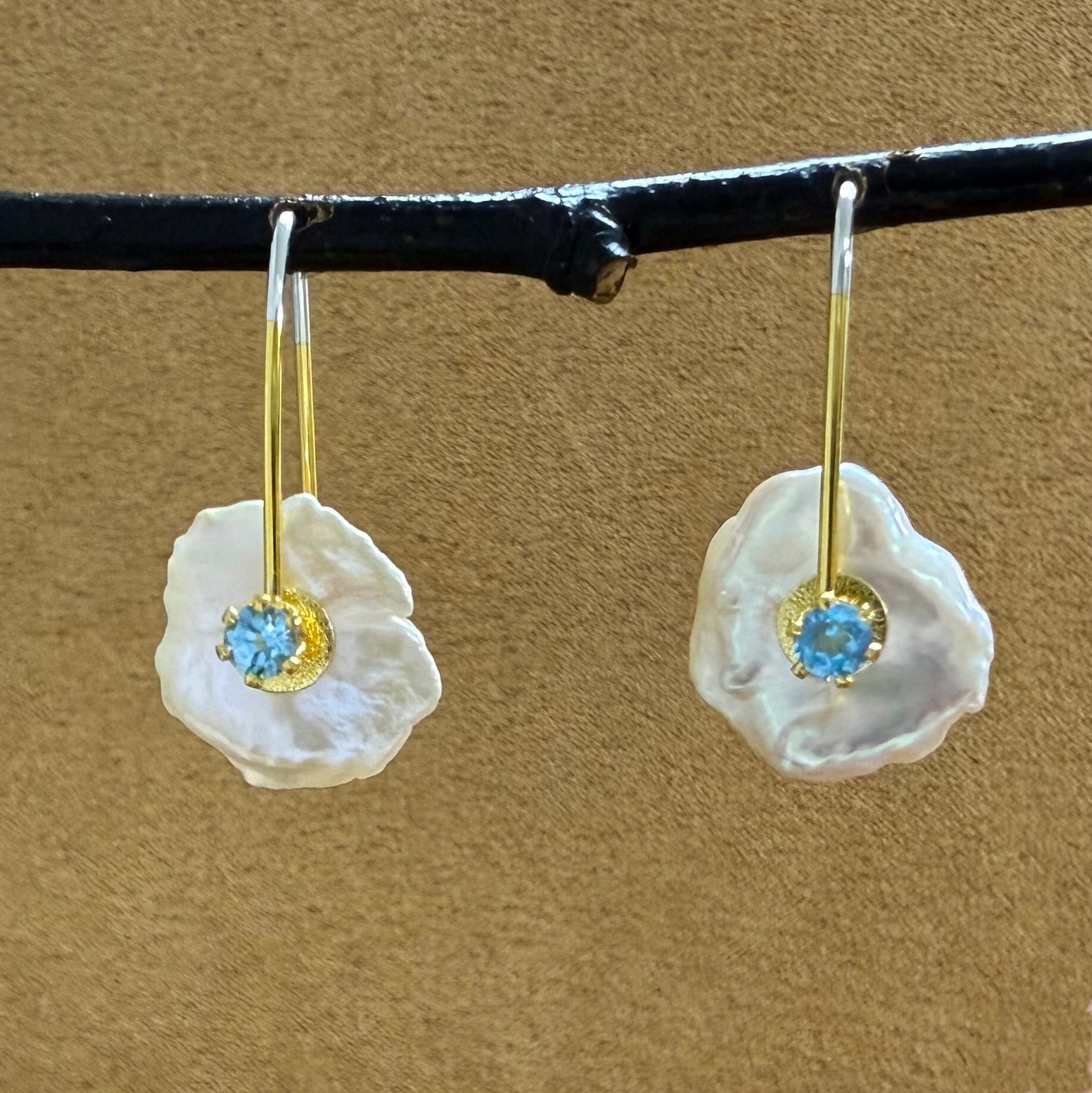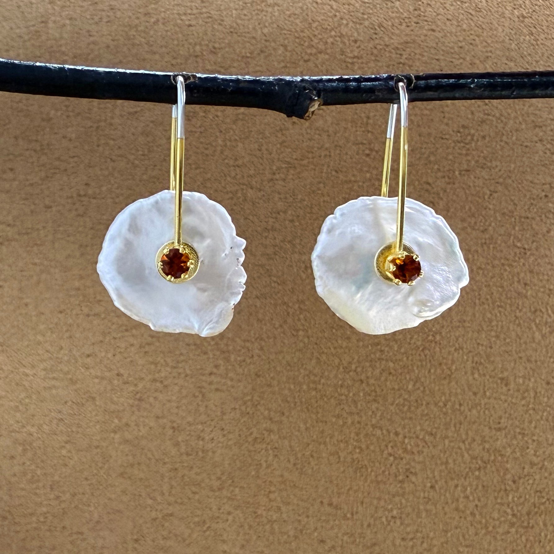 Keshi* Pearls are a kind of flat pearl that forms without a nucleus, so instead of creating a spherical shape, the nacre forms a disc. No two pairs are the same. I contrast these unique shapes with the preciseness of faceted semi-precious stones in the center. The ear wires are sterling silver plated with 18k gold (vermeil), left sterling where they rest in the ear, and they clip closed in the back.