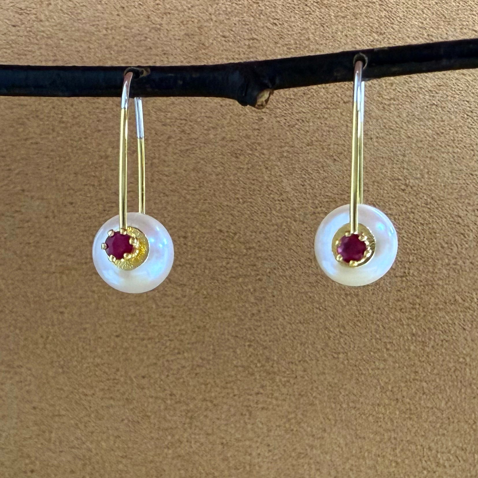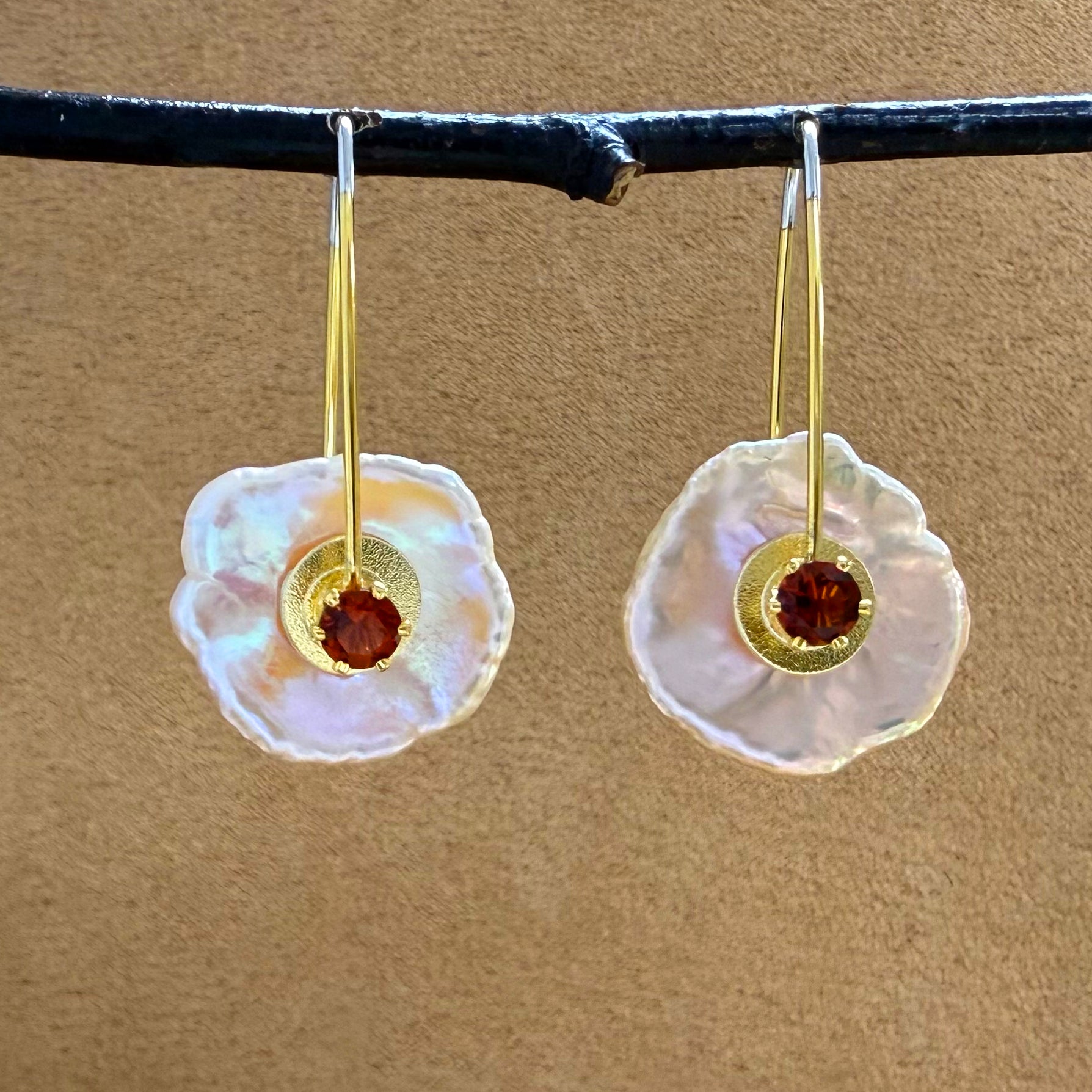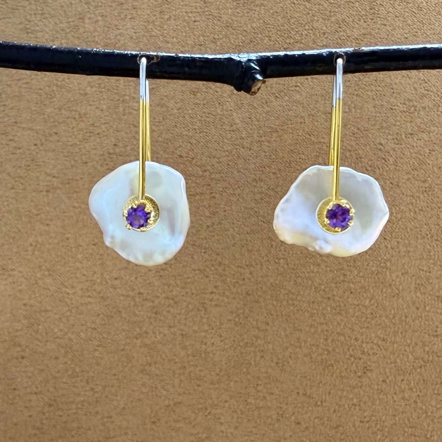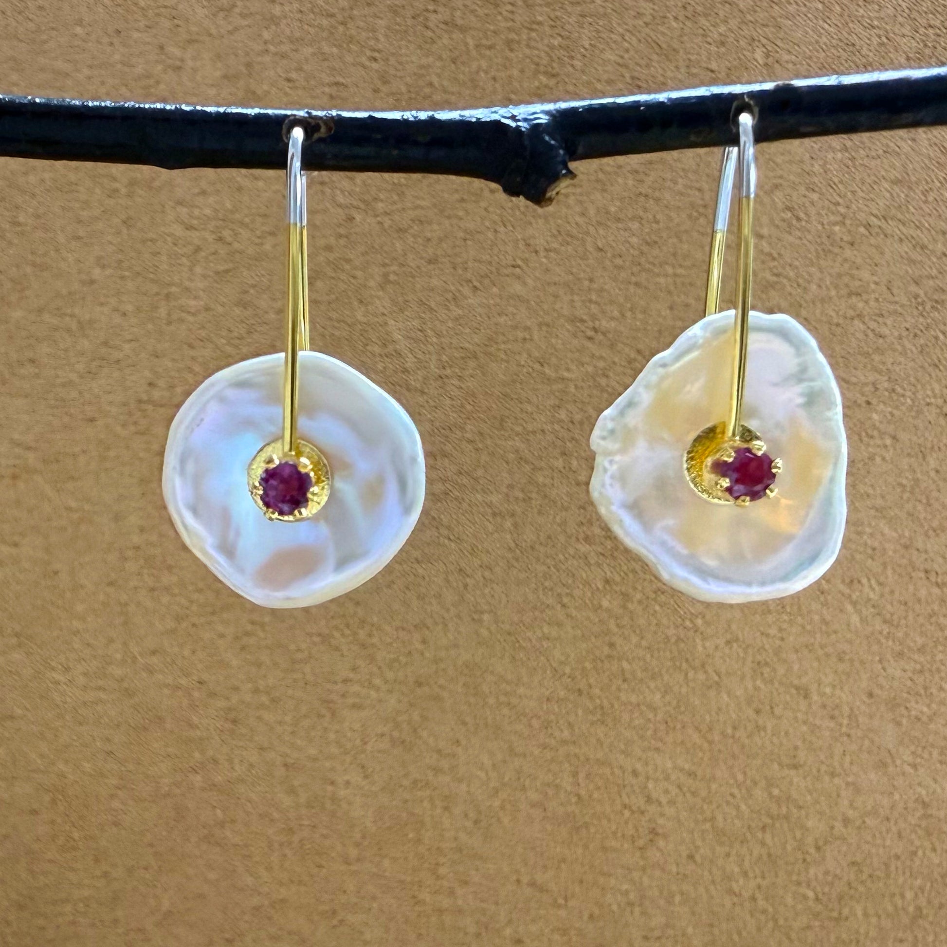 Keshi* Pearls are a kind of flat pearl that forms without a nucleus, so instead of creating a spherical shape, the nacre forms a disc. No two pairs are the same. I contrast these unique shapes with the preciseness of faceted semi-precious stones in the center. The ear wires are sterling silver plated with 18k gold (vermeil), left sterling where they rest in the ear, and they clip closed in the back.