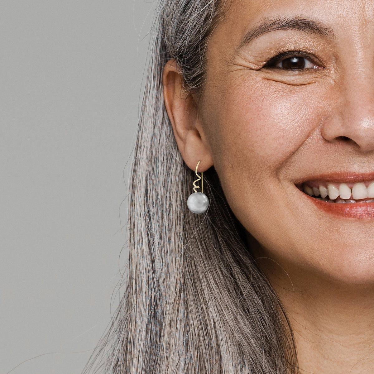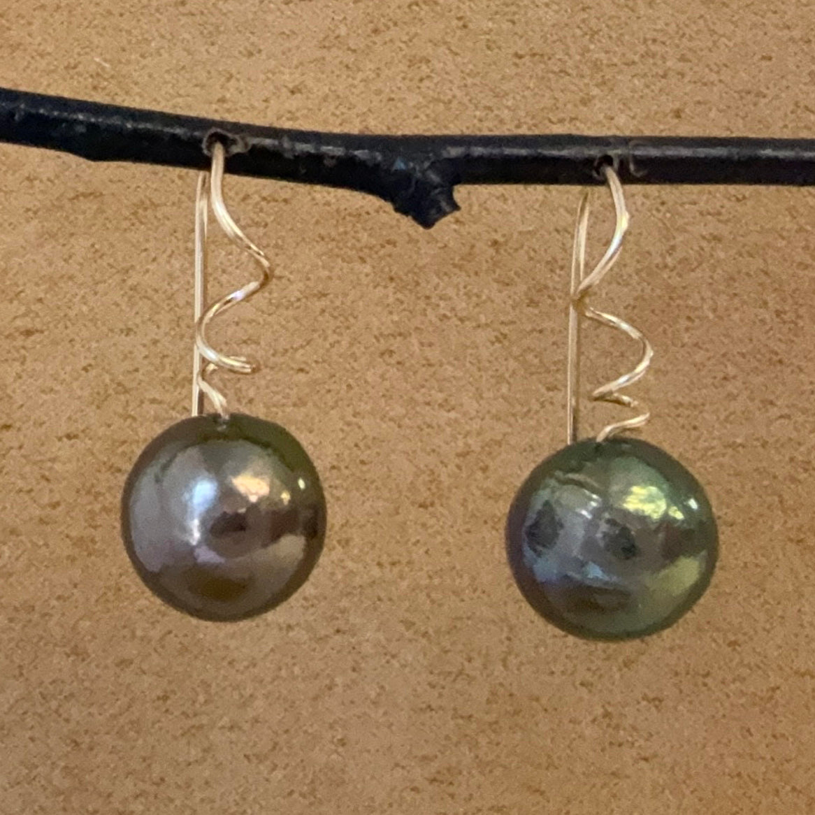 Made from luminous round and oval pearls I sourced from the American Gem Trade Association GemFair in Tucson earlier this year. They have tendril-like ear wires which clip closed in the back. I drill through the pearls with an ultrasonic drill using a slurry of water and fine grit. I spiral the ear wire and feed it directly through the pearl, which makes them very secure.