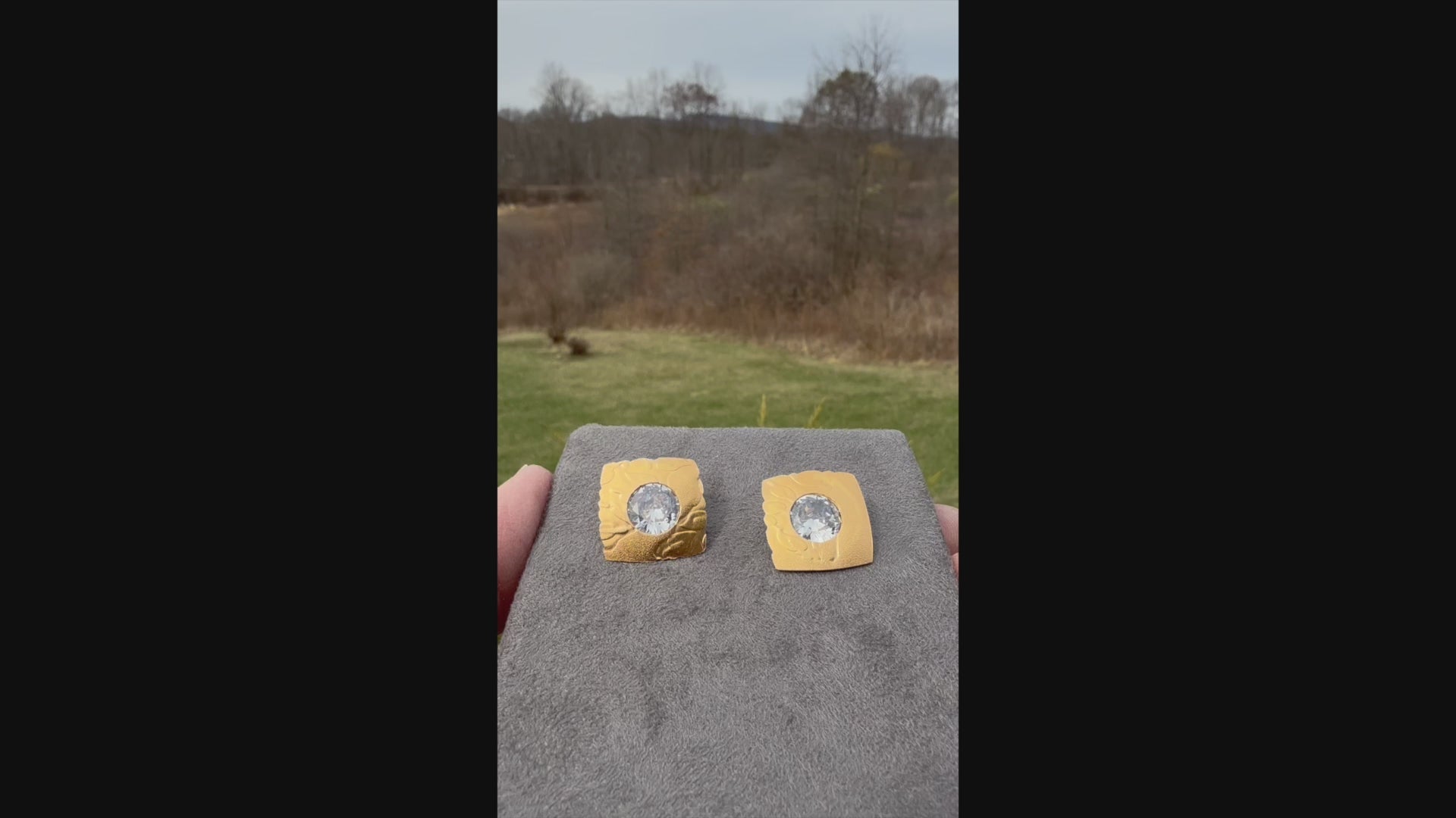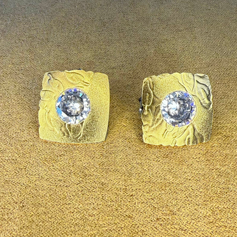 These uniquely embossed earrings are made of 22k vermeil over sterling with 10mm cubic zirconia. 14 karat gold posts on oxidized sterling backs. Inspired by some incredibly sparkly earrings I saw on a pianist at Carnegie Hall!